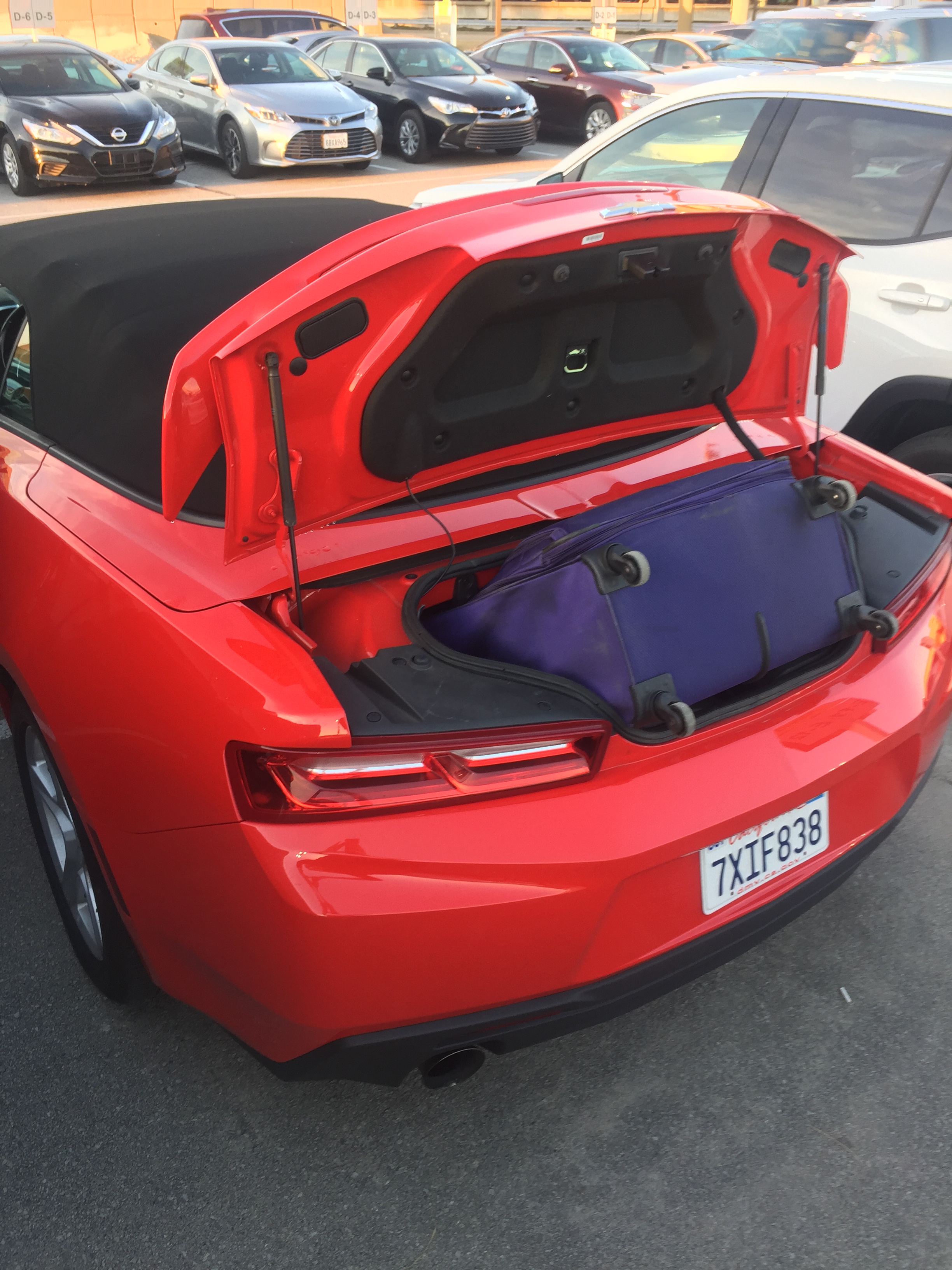 My first challenge was space. My international suitcase was NOT going to fit in the back of this sports car.